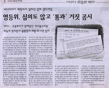 한겨레는 4면 <영등위, 심의도 않고 '통과' 거짓 공시>에서 "영상물등급위원회(영등위)가 '바다이야기'를 허용하기 이전인 2003년에도 바다이야기 제조업자의 스크린경마게임을 심의하지도 않고 심의가 난 것처럼 영등위 사이트에 거짓 공시했던 것으로 밝혀졌다"며 "또 업체 쪽은 이를 곧바로 코스닥 공시자료로 활용했으며 영등위는 거짓 공시 사실이 드러나자 관련 직원을 견책하는 선에서 사건을 서둘러 덮은 것으로 확인됐다"고 보도했다.