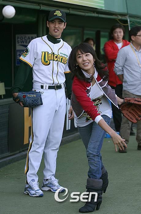 13일 수원 야구장 2006 프로야구 플레이오프 1차전 현대 유니콘스와 한화 이글스 경기가 열리기전 시구자 인기 탤런트 윤정희가 장원삼으로 부터 원포인트 레슨을 받고 있다./수원=김영민 기자ajyoung@osen.co.kr