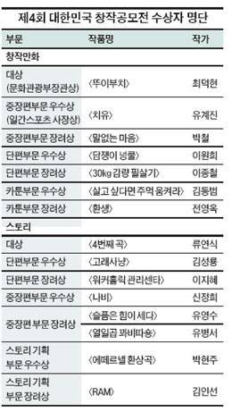 유계진씨의 <치유>는 중장편 부문 1등인 일간스포츠 사장상을. 이원희씨의 <담쟁이 넝쿨>이 단편 부문 우수상을. 김동명씨의 <살고 싶다면 주먹 움켜라>가 카툰 부문 우수상을. 류연식씨의 <4번째 곡>이 스토리 부문 대상을 수상했다.