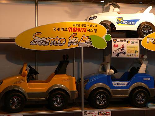 ◇ 새싹토이에서 선보인 위험방지 시스템 내장 전동차 '산토페(Santo Fe)'. 원격 리모컨이 별도로 있어, 위험 상황에서 부모가 원격으로 자동차를 조정 할 수 있다.