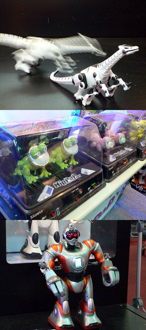 ◇ 지엔에프엔터프라이즈가 선보인 '로보렙타일(Roboreptile)'. 파충류를 소재로 한 무선 작동완구다. 무선 조종기를 이용해 움직이지만, 자유모드 기능으로 물체를 인식해 자유롭게 움직이기도 한다.(첫번째 사진) ◇ MP3 플레이어 등에 연결, 음악에 맞춰 LED가 깜빡이거나 발을 구르는 등 움직임을 표현하는 외장 스피커 힙팝펫(HipPop Pet).(두번째 사진) ◇ 휴머노이드 로봇 '로보사피엔(Robosapien)' 신제품. MP3 파일 재생기능은 물론이고, 내장 액정을 통해 자바 기반의 간단한 게임도 즐길 수 있다. (세번째 사진)