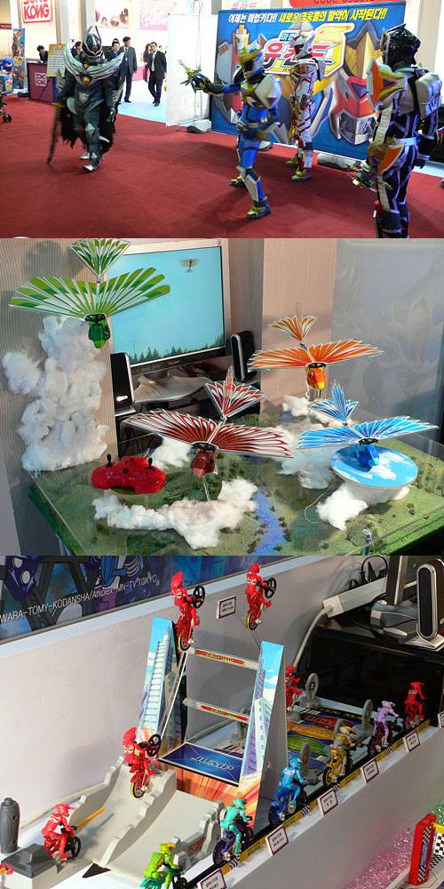 ◇ 어린이 관객들을 사로잡기 위한 손오공 개발 신제품들. 대형 캐릭터들이 어린이 관객들 앞에서 '마법전사 유캔도 뮤지컬'을 보여주고 있다.(첫번째 사진) ◇ 원격 조정기로 하늘에 날릴 수 있는 비행완구 스카이 버드. (두번째 사진) ◇ 만화영화 '달려라 이다텐'의 주인공인 MTB 프레임 카이저 완구. 기어 손잡이를 잡아당기면 MTB 완구가 튀어 오르는 형태로 되어 있다. (세번째 사진)