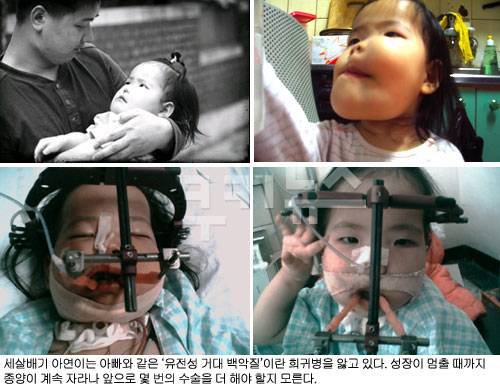 얼굴 전체에 종양이 자라나는 병. 우리나라에 환자가 단 3명뿐인 희귀병 중의 희귀병을 아빠 이영학(25)씨와 딸 아연이가 함께 앓고 있다. 끝없이 자라나는 종양을 제거하는 것만이 유일한 치료법이다.
