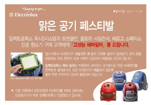 옥시3시스템과 트윈클린, 울트라 사일런서, 에르고 스페이스 등 일렉트로룩스 제품을 구입하는 고객들에게 미세먼지 배출을 막는 필터를 주는 행사다.