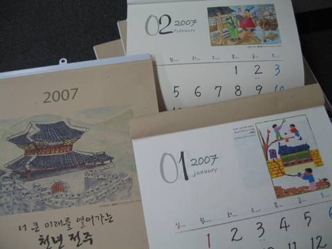 새해 첫달인 1월은 남부시장 콩나물국밥집 주인인 조명심씨의 숫자 글씨에 용소초등학교 6년 이혜미양이 그린 '눈오는 한옥마을서 뛰노는 아이들' 그림이 장식됐다.
