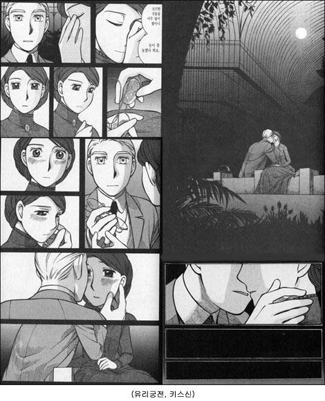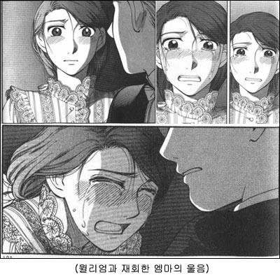 하지만 이런 메이드물의 흐름에 반기를 든 작품이 있었습니다. 바로 모리 카오루의 <엠마>입니다. 작품의 배경은 19세기 초의 영국 런던. 부잣집 도련님인 윌리엄과 메이드인 엠마의 사랑을 다룬 작품입니다. <엠마>에는 여타 메이드물에서 빈번하게 등장하는 눈요기 장면(노출 장면)도 없고, 메이드를 성적 도구로 생각하는 경박한 남자도 존재하지 않습니다. 윌리엄과 엠마의 관계도 메이드물의 컨벤션처럼 자리잡은 노출 없이 지고지순한 사랑으로 이끌어갑니다. 특히 달빛아래 유리궁전에서 두 사람이 첫 키스를 하게 되는 장면의 섬세한 장면처리처럼, 인물의 심리를 상당히 디테일하게 묘사해내는 데 집중합니다.
