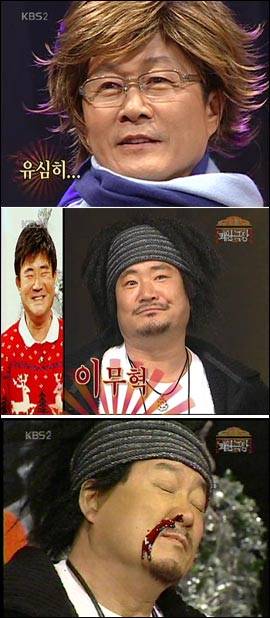 펑키한 헤어스타일에 헤어밴드까지 소지섭 패션을 따라잡기한 노주현은 그의 덩치와 안어울리는 미니 오토바이에 올라 물엿으로 코피를 흘리는 혼신의 연기로 무대를 뒤집어 놨다. 슬픈 대목이었지만 리얼한 능청 연기로 오히려 대폭소를 자아냈다.