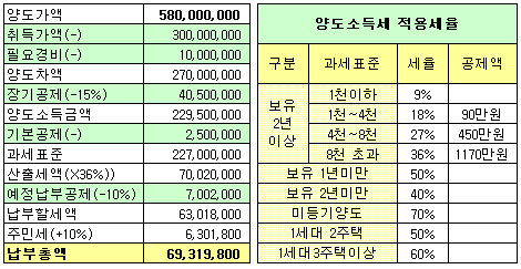 여기에 주택을 보유한 기간에 따라 특별공제(2007년부터 1가구 2주택 장기보유특별공제 배제)를 받는데 5년 이상이므로 15%의 공제를 받게 된다. 또한 년간 250만원의 양도소득의 기본공제를 받고 나서 세율에 따라 산출세액을 계산하고 예정납부 세액공제를 하고 나면 납부총액이 6931만9800원이 된다.