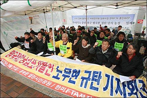 | ▲ 한미FTA 협상 중단을 촉구하며 광화문 열린시민공원에서 집단단식농성에 돌입한 한미FTA 범국본은 21일 농성장에서 '망국적 농업 포기 발언 노무현 규탄 기자회견'을 열었다. |