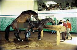 그래서 강제로 끌어내는데 급한 놈은 그 과정에 허공에 욕구를 분출, 그 양이 워낙 많아 주변의 교배사들이 전신에 정액 세례를 받기도 한다. 그러나 그것조차도 이루지 못한채 강제로 끌려나가는 시정마는 불쌍하기 그지없다.