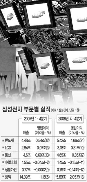 비수기인 데다 반도체와 LCD 패널 가격 하락이 가장 큰 요인이었다. 반면 휴대전화에서는 '프리미엄'보다 '신흥시장'을 겨냥한 중저가 제품들이 선전했고, 가전 부문도 나름대로 적자를 줄였다.