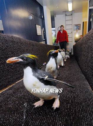 <yonhapPHOTO-0276> This photo provided by SeaWorld San Diego shows macaroni penguins waddling up a ramp to their refurbished Penguin Encounter habitat at SeaWorld San Diego in San Diego, Wednesday, May 2, 2007. The new Penguin Encounter boasts a complete face lift, with additional rockwork and ice, modified lighting and an entirely new refrigeration system for more efficient cooling providing a constant 25 degrees Fahrenheit. (AP Photo/SeaWorld San Diego, Mike Aguilera) ** NO SALES **/2007-05-04 05:35:36/