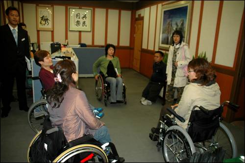 | ▲ '4·20 장애인 차별철폐 경남공동투쟁단'은 '노예모자 사건'과 관련해 지난 4월 9일 합천군청을 항의 방문했다. |