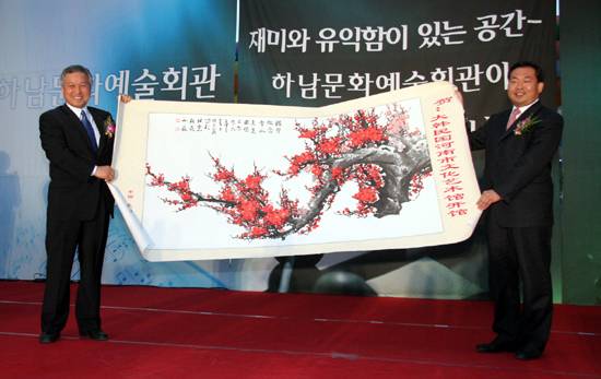 | ◇ 11일, 하남문화예술회관 개관 기념식 중 자매결연도시인 중국 유산시 이홍의 시장이 하남문화예술회관 김태기 관장에게 그림을 선물하고 있다. ⓒ 이병훈기자 |
