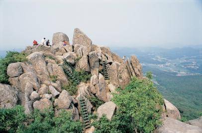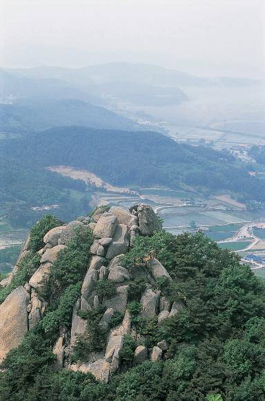 완만한 경사의 계단길을 10분만 오르면 벌써 능선이다. 이 곳은 1봉과 2봉 사이의 안부로 왼쪽은 1봉, 오른쪽은 2봉을 경유 3봉 정상으로 가는 길이다. 갔다가 되돌아오는 일이 다소 번거롭더라도 1봉의 주변 경관과 전망을 놓치지 않는 게 좋다. 바위를 첩첩이 쌓은 1봉에 턱 올라서는 순간 북쪽으로 열린 서해바다와 2봉과 3봉 바위를 뒤덮은 신록이 한 눈에 들어온다. 안부로 다시 내려와 2봉으로 향하는 길은 제법 가파르고 철계단이 설치되어 있다. 철계단을 올라 10분 지나면 2봉을 은근슬쩍 넘어서고 곧 헬기장이 나온다. 헬기장에서 정상을 한번 쳐다보고 걸으면 이번에는 긴 철계단이 나타난다. 철계단 안쪽은 통천굴인데 정상이 코앞이다. 철계단보다는 통천굴을 통과하는 것이 좀더 극적이다.