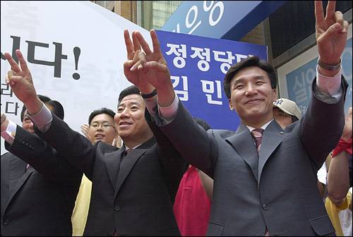 | ▲ 지난 2002년 5월 서울 명동에서 열린 민주당 김민석 서울시장후보 정당연설회에서 노무현 대선후보와 김민석 서울시장후보가 지지를 호소하고 있다. |