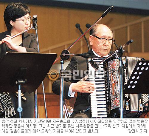 시골 교회까지 찾아가 아코디언을 연주하며 부흥의 불씨를 키워가고 있는 장 이사장은 앞으로 '12제자 아코디언 연주단'을 창단, 음악 선교 사역에 적극 나설 계획이다. 또 몽골을 거점으로 중앙아시아 선교를 위해 승마 선교 사역도 준비 중이다. 벌써 천안캠퍼스에 승마부를 신설, 그 꿈을 구체화하고 있다.