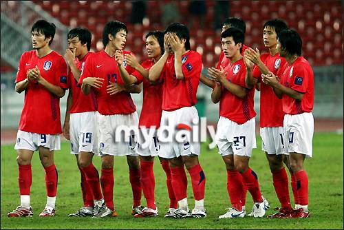 [마이데일리 = 말레이시아 쿠알라룸푸르 송일섭 기자] 25일 오후 말레이시아 쿠알라룸푸르 부킷 잘릴 국립경기장에서 열린 2007 아시안컵 대한민국 vs 이라크의 4강전 경기에서 김진규(가운데)가 승부차기 도중 얼굴을 가리고 있다.