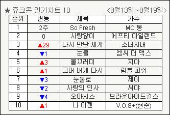 MC몽은 음악사이트 쥬크온이 지난 13일부터 19일까지 집계한 '인기차트 10'에서 노래 '소 프레시(So Fresh)'로 2주 연속 1위를 기록했다.
