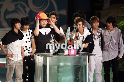 [마이데일리 = 곽경훈 기자]그룹 슈퍼주니어가 21일 오후 서울 광장동 워커힐호텔에서 열린 '2007 Mnet SUMMER BREAK 20's CHOICE'에 참석해 HOT의 행복의 부르며 축하무대를 만들고 있다.