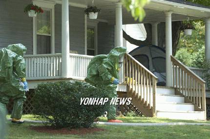 <yonhapPHOTO-0169> State environmental workers prepare to enter a home in Danbury, Conn. Thursday Sept. 6, 2007. State environmental officials say they've found contamination in the Danbury home and barn where two members of a family contracted cutaneous anthrax. The family members work with animal hides used to make African drums. They each have been treated for skin spots that looked like scabs. The cutaneous form of anthrax is not contagious and can be treated with antibiotics.(AP Photo/Douglas Healey)/2007-09-07 05:57:58/