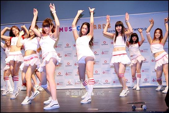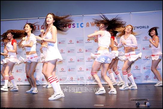 여성 10대 9인조 그룹 소녀시대가 12일 오후 서울 압구정 CGV에서 열린 '싸이월드 디지털 뮤직 어워드'(Digital Music Award) 시상식에서 지난 8월의 '이달의 신인'(Rookie Of The Month) 수상자로 선정된 뒤 축하 무대를 갖고 있다.