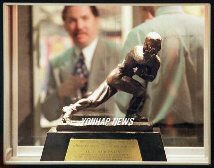 <yonhapPHOTO-0204> ** FILE ** Michael Schwartz, director of entertainment memorabilia for the auction house of Butterfield & Butterfield, is seen through a display case containing O.J. Simpson's 1968 Heisman Trophy at their gallery in this Feb. 10, 1999 file photo, in Los Angeles. The auction house conducted a court-ordered auction of Simpson items in 1999 to help pay off a $33.5-million award won by the Brown and Goldman families in a wrongful death lawsuit. Simpson's 1968 Heisman Trophy was sold for $255,500 to Tom Kriessman, a Philadelphia steel company owner who said he purchased it as an investment and to impress his girlfriend. (AP Photo/Rene Macura, File)/2007-09-15 08:10:10/