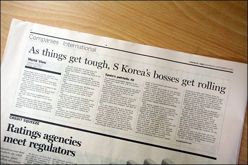 영국의 경제신문인 파이낸셜 타임스(FT)의 12일치 신문 제목이다. 경제면(기업/국제) 머릿기사로 실린 이번 기사는 내용만으론 그리 길지 않다. 하지만, 제목은 5단 전체를 덮었다. 편집자의 의도가 엿보이는 대목이다.