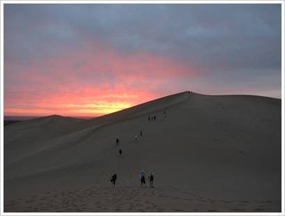 ◇모래가 울음소리를 낸다는 밍사산 일출의 장엄함=밍사산(鳴沙山)은 하나의 봉우리가 아니라 동서로 40㎞, 남북으로 20㎞에 걸쳐 분포한 모래 구릉을 모두 지칭한다. 자료에 의하면 가장 높은 곳이 약 1650m라고 하지만 지면 자체가 고지대이기 때문에 실제 모래 산의 높이는 300m 남짓하다. 밍사산은 한자로 `鳴沙山'이지만 간혹 `溟沙山'으로 표기하기도 한다. 전자는 모래가 울음소리를 낸다는 뜻이고 후자는 물이 절대 부족했기 때문에 생겨난 이름이니 둘 다 지역의 특성인 모래와 연관이 깊다.