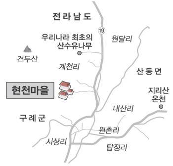 구례군 자료에는 "마을 뒷산인 견두산이 현(玄)자 형으로 되어 있고 뒷내에는 옥녀봉의 옥녀가 매일같이 빨래를 하고 선비가 고기를 낚는 어옹수조(魚翁水釣)가 있어 그 아름다움을 형용하여 현천이라 하였다."고 서술돼 있다. 꽃이 피는 3월을 제외하곤 대체로 조용한 현천엔 민박 간판을 내건 집도, 음료를 파는 구멍가게도 없다. 아궁이에 군불을 지피는지 굴뚝마다 장작 타는 냄새만 송글송글 푸근하다.