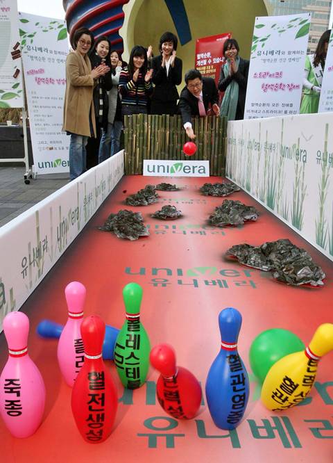 12일 오전 서울 광화문 청계광장에서 열린 '볼링 게임을 통한 혈액순환장애 타파' 이벤트에 참가한 시민들이 볼링공을 굴리며 즐거워하고 있다.