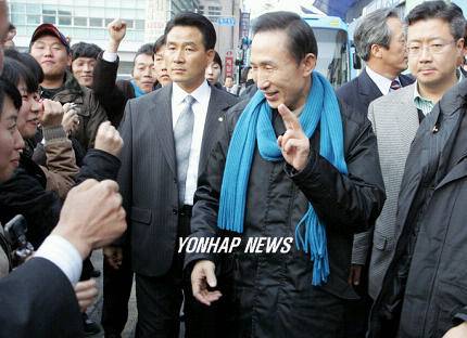 (대전=연합뉴스) 진성철 기자 = 한나라당 이명박(李明博) 대선후보가 7일 대전 중구 대전시당에서 열린 대전충남지역 확대선거대책회의에서 지지자들과 악수하고 있다.