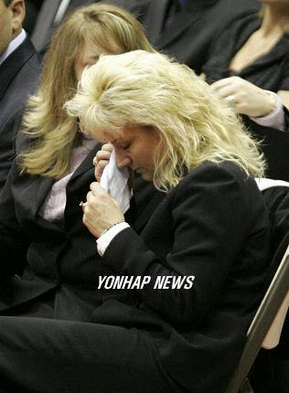 <yonhapPHOTO-0284> Krystal Kennedy-Knievel wipes away tears during the memorial service for her husband, motorcycle daredevil Evel Knievel, in Butte, Mont., Monday, Dec. 10, 2007. Knievel died Nov. 30 at the age of 69 after years of battling diabetes and pulmonary fibrosis. (AP Photo/Don Ryan) /2007-12-11 06:20:58/
