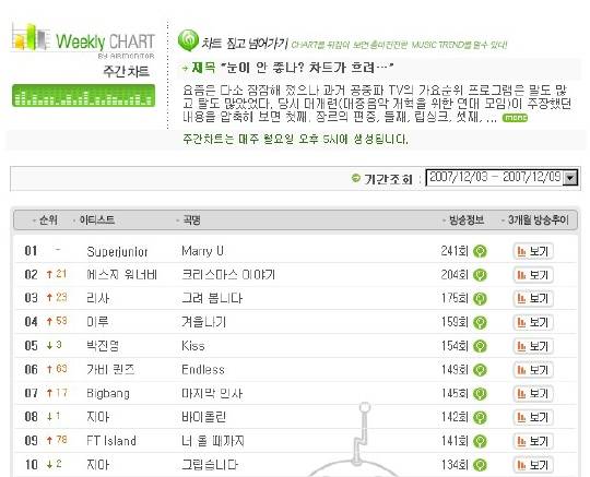 [OSEN=김지연 기자] 슈퍼주니어의 후속곡 'Marry U'가 방송횟수 종합차트에서 2주 연속 1위를 차지했다.