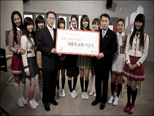 엘리트학생복 측은 12일 "자사모델로 활동 중인 소녀시대 측이 기부 의사를 밝혀왔다"며 "소녀시대가 소년소녀 가장을 위해 1000만원 상당의 교복을 기부하기로 했다"고 밝혔다.