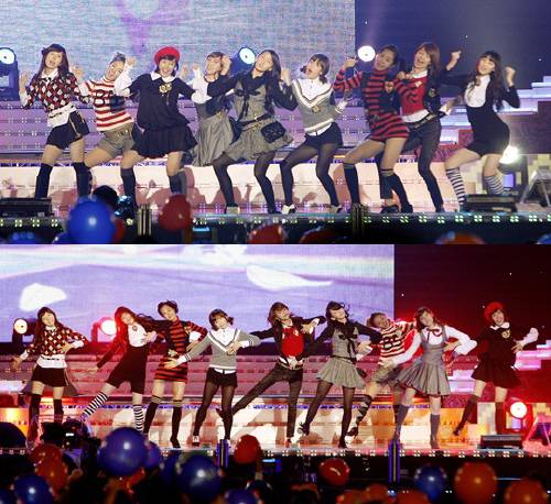 | 소녀시대가 '소녀시대'를 부르며 앙탈춤(위)과 인형춤을 선보이고 있다. ⓒSM 엔터테인먼트 |