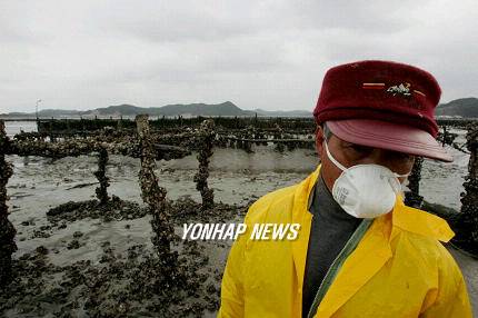 epa01199484 South Korean oyster farmer looks at oil covered oyster at his oyster farm in Shinduri beach, about 170km southwest of Seoul, South Korea. 13 December 2007. South Korea's coast guard sent boats to contain what is said to be the country's biggest oil spill in more than a decade after a Hong Kong registered supertanker collided with a barge. EPA/JEON HEON-KYUN