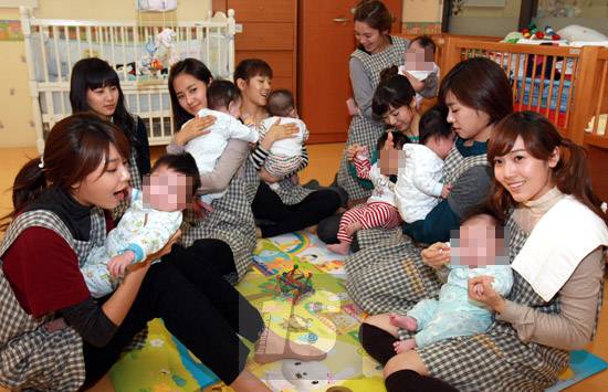 19일 오후 3시 서울 합정동 홀트 아동복지회 일시 보호소에 9명의 '새내기 엄마'들이 나타났다. 9인조 여성그룹 소녀시대가 그 주인공. 평균 나이 만 18세의 초보 엄마들은 해외 입양을 앞두고 복지회 시설에서 일시 보육 중인 생후 3~11개월의 갓난 아기들을 만났다.