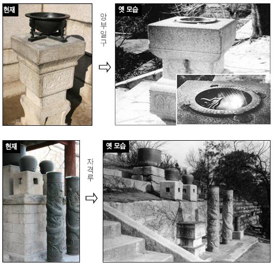 해시계인 앙부일구(仰釜日晷)와 물시계인 자격루(自擊漏)의 원래 모습이 현재 복원돼 있는 상태와 다른 것으로 조선궁궐의 옛모습을 담은 사진을 통해 확인됐다.