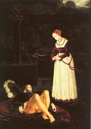 주로 생의 덧없음을 소재로 독특한 작품 세계를 펼친 작가 한스 발둥 그린은 두 연인의 비극을 처연하게 화폭에 풀어냈다. 어둑어둑한 숲 속에 피라모스의 피로 물든 망토와 티스베의 흰 스커트가 극명한 대비를 이루며 비극성을 한층 높여준다.