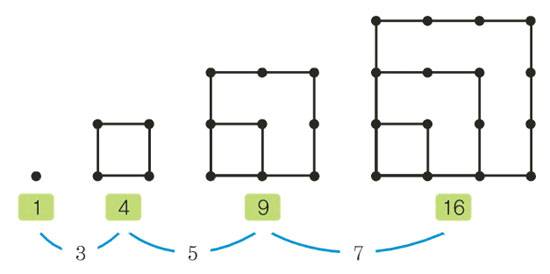 (2) 사각수: 사각형으로 표현된 수로 점의 개수가 1, 4, 9, 16...로 배열된다.