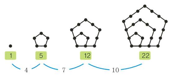 (3) 오각수: 오각형의 배열로 표현된 수로 점의 개수가 1, 5, 12, 22...로 배열된다.