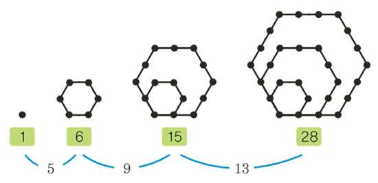 (4) 육각수: 육각형의 배열로 표현된 수로 점의 개수가 1, 6, 15, 28...로 배열된다.