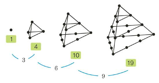(5) 삼각뿔수: 삼각뿔의 배열로 표현된 수로 1, 4, 10, 19...로 배열된다.