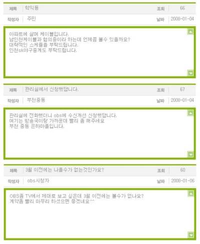 | ▲ OBS경인TV 홈페이지의 수신관련 문의 글 | ||