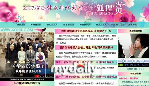 이밖에 영화 부문에서는 '화려한 휴가'가 최고영화상으로 주목받았다. 안성기가 최고연기자로 선정됐으며 이준기와 미야자키 아오이는 '첫눈'으로 최고의 스크린 커플로 선망받았다. '꽃미남연쇄테러사건'의 슈퍼주니어가 신인연기상을 차지했고 정경호 김민선 주연의 '별빛 속으로'를 중국네티즌들은 '매우 훌륭하나 덜 주목받은 영화'로 아쉬워했다고 소후는 밝혔다.