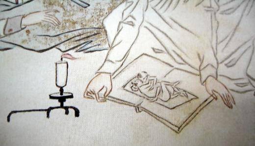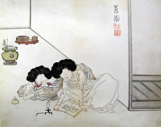 두 여자의 앞에 놓인 것은 그림책이다. 그림책을 자세히 보면 예사 그림책이 아님을 알 것이다. 사람 둘이 엉켜 있다. 바로 남녀의 성관계를 그린 것이다. 그림은 여러 장으로 만들어져 있고, 한 페이지씩 넘겨보게 되어 있다. 이 그림은 환하게 그려져 있지만, 사실은 어두운 방안이다. 왜냐고? 그림책 앞의 촛불을 보라. 불꽃은 바람에 날려 오른쪽으로 드러눕다시피 하여 꺼질락 말락 하고 있다. 어두운 밤의 방안이 아니고 무엇이겠는가. 은밀히 두 여인이 한밤중에 춘화를 보고 있는 것이다.