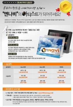 ■ SK에너지는 내비게이터 소프트웨어 '엔나비 꾸미기 공모전(사진)'을 다음 달 5일까지 진행한다. 제품 구동 시 나오는 초기화면과 음악, 위치 아이콘 등 3가지 분야로 나눠 실시되며, 우수작에게는 600만원의 상금과 상패, 기념품 등이 제공된다. 자세한 내용은 엔나비 홈페이지(www.ennavi.co.kr)에서 확인하면 된다.