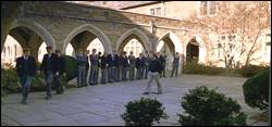 학생들이 한 줄로 서 있다. 카메론, 핏츠, 그리고 녹스가 원을 그리며 걷는다. 키팅이 아이들이 도는 것을 보고 있다.