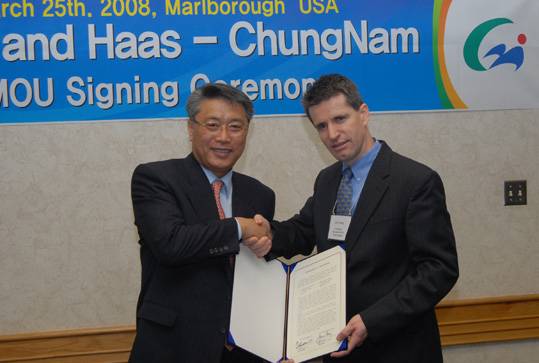 채훈 충남도 경제부지사는 25일(현지시간) 미국 보스톤에서 첨단 전자재료 생산업체인 롬앤하스(Rohm & Haas)의 제임스 화에이(James Fahey) 부사장과 감광제(Photoresist)등 LCD부품 생산 및 R&D 시설확충을 위해 600만달러(기존투자 3000만달러)을 추가로 투자하는 협약을 체결했다.